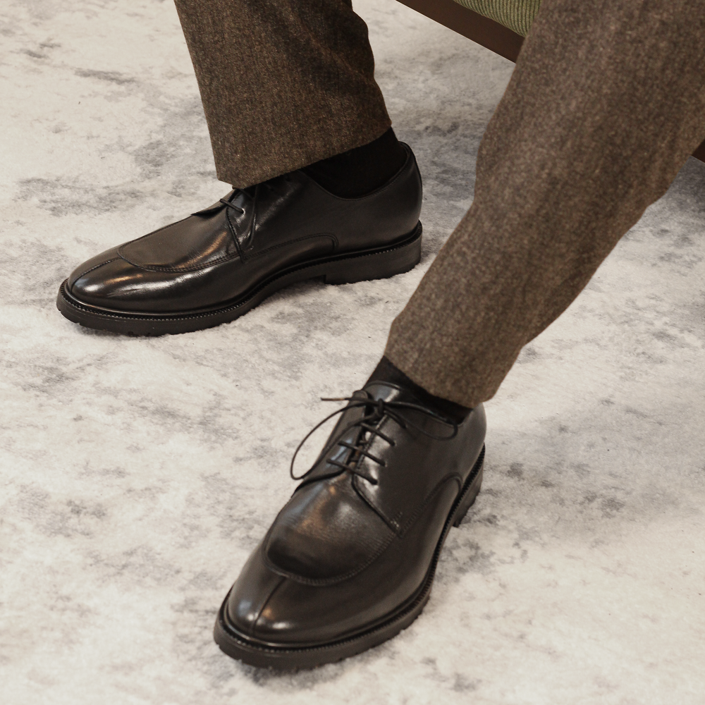 Moins formelle que sa cousine la richelieu, la derby pour homme n’en reste pas moins un classique incontournable du vestiaire masculin. Cette chaussure emblématique se distingue par un laçage « ouvert » avec œillets positionnés sur deux empiècements cousus sur le soulier. Une particularité qui permet un laçage plus large au niveau de l’empeigne, offrant ainsi plus d’amplitude aux cous-de-pied forts.